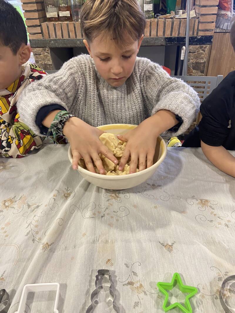 Una vez explicado el procedimiento, todos colaboraron en la preparación de la masa, cada uno tomando su turno para mezclar, amasar y cortar las formas navideñas. Mientras las galletas se horneaban, aprovechamos ese tiempo para realizar otra actividad.